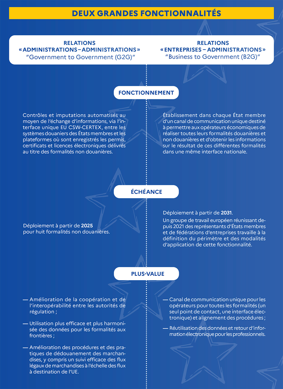 Actuellement, les formalités requises aux frontières de l'UE sont souvent longues et complexes pour les opérateurs et les autorités nationales. Les problèmes d'interopérabilité entre les autorités ont été identifiés comme principal obstacle à l'intégration de la gestion douanière et plus largement aux progrès du marché unique numérique. Avec le "guichet unique" de l'UE, les douanes et les autres autorités pourront à terme vérifier automatiquement et numériquement que les marchandises sont conformes aux exigences de l'UE et que les formalités nécessaires ont été accomplies, offrant une approche entièrement coordonnée du dédouanement des marchandises.