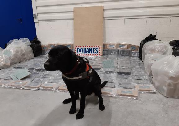 Le chien de service marque nettement lors de la fouille de la remorque au niveau de deux palettes placées au milieu du chargement. La vérification effectuée par le service permet la découverte de cocaïne dissimulée dans ces deux palettes.