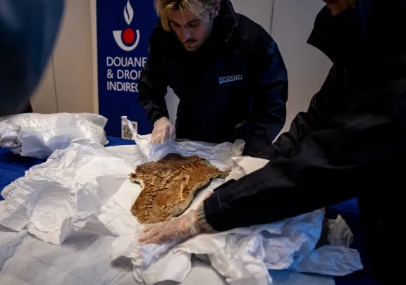 Remise aux autorités de Mongolie d’un squelette de Tarbosaurus bataar ainsi que de nombreuses parties de dinosaures saisis par la Douane
